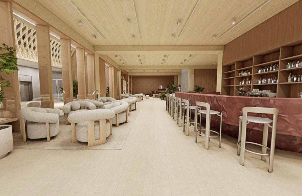 The beautiful timber vaulted lobby is 6.5m high and provides a striking arrival experience, complemented by beautifully crafted interiors using natural and sustainable materials throughout.