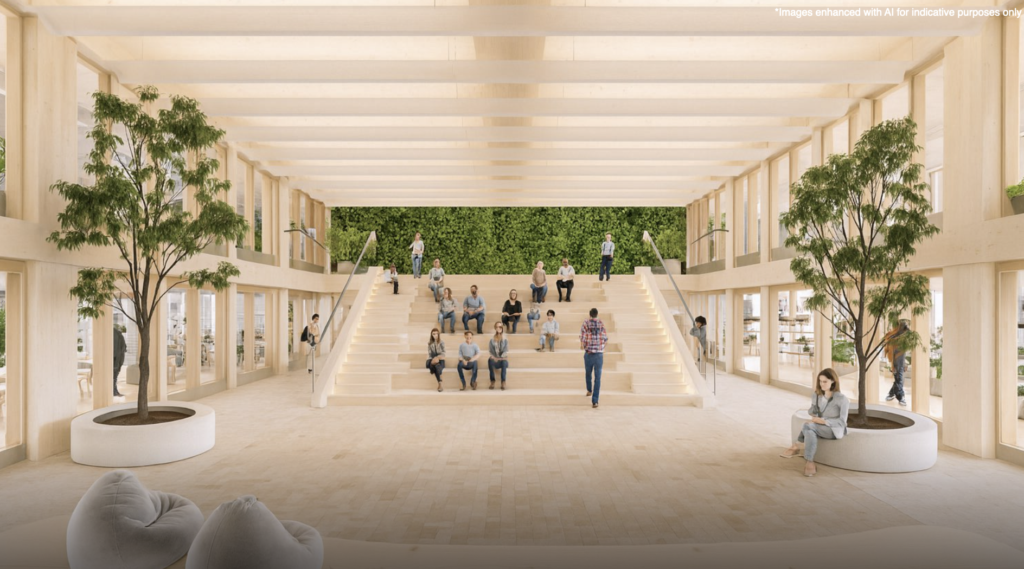 The building is designed to support both performance and wellbeing, with amenities including a landscaped roof garden, double-height town hall and social hub, end-of-journey facilities and an on-site café.
