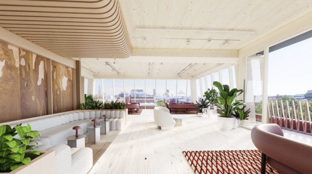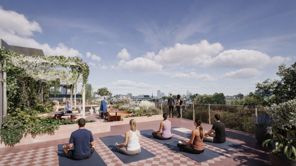 A 3,800 sq ft rooftop garden and yoga deck on level nine offers a calm retreat with views across the City and over Gray’s Inn Gardens. Designed for both focus and downtime, the space features a bar, flexible seating, a sun canopy, space for yoga and abundant planting.